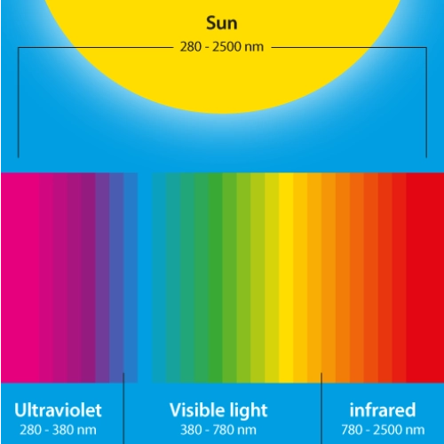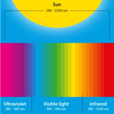 UV radiation is sunlight with the shortest wavelength - up to 380 nm. Due to absorption from the atmosphere, only the parts above 300 nm reach us. (UVB and UVA bands) UV light is invisible to the human eye.