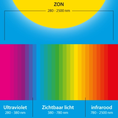 Dit is het onzichtbare deel van het zonlicht met golflengten van 780 nm tot 2500 nm. Infrarood licht vertegenwoordigt het verwarmende gedeelte van het zonlicht.